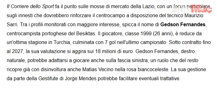 Haberde, Lazio Teknik Direktörü Maurizio Sarri’nin Gedson Fernandes’in temposunu ve teknik becerilerini beğendiği, bu özelliklerin kendi oyun sistemine son derece uygun olduğunu düşündüğü aktarıldı.
