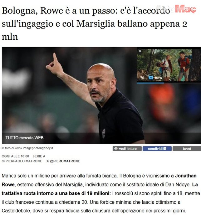 Önümüzdeki hafta, İtalyan kulübünün Rowe’u resmen açıklayacağı öngörülüyor. Geçtiğimiz sezon Marsilya formasıyla 30 maça çıkan 22 yaşındaki oyuncu, 3 gol ve 4 asistlik performans sergilemişti.