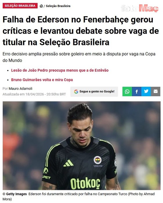 Son dakika Fenerbahçe haberleri: Trendyol Süper Lig’in 30. haftasında sahasında Çaykur Rizespor ile uzatma dakikalarında yediği golle 2-2 berabere kalan Fenerbahçe’de eleştiri okları Ederson’a çevrildi. Yaptığı hata sonrası takımının gol yemesine sebebiyet vererek sarı-lacivertlilerin tepkisini çeken Brezilyalı file bekçisi, ülkesinde de krize neden oldu. İşte detaylar… (fotomac.com.tr/DIŞ HABERLER)