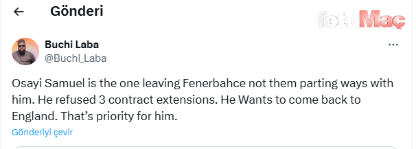 Nijeryalı gazeteci Buchi Laba’nın haberine göre; Fenerbahçe’nin 3 defa yaptığı mukavele uzatma teklifini reddeden yıldız oyuncu İngiltere’ye transfer olmak istiyor.