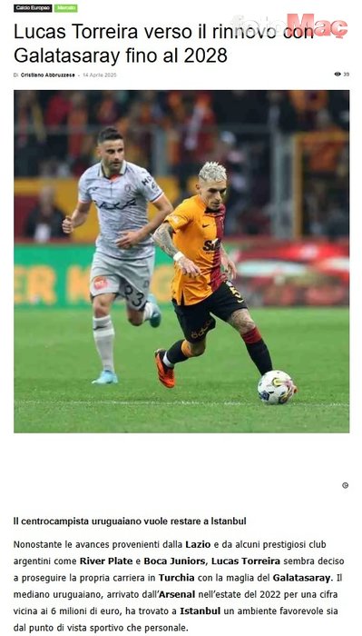 Europa Calcio’da yer alan habere göre; Galatasaray, Lucas Torreira’nın mukavelesini 2028 yılına kadar uzatacak.