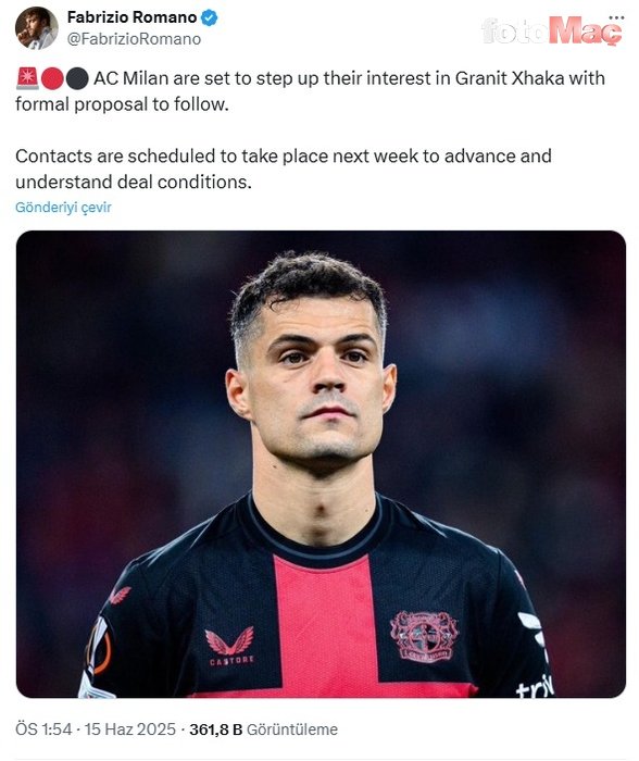 Ayrıca teklif yapmaya hazırlanan kırmızı-siyahlıların önümüzdeki hafta Alman ekibiyle resmi temaslara geçeceği aktarıldı. Leverkusen’in Xhaka için 15-20 milyon Euro’luk bir bonservis talebi olduğu biliniyor.