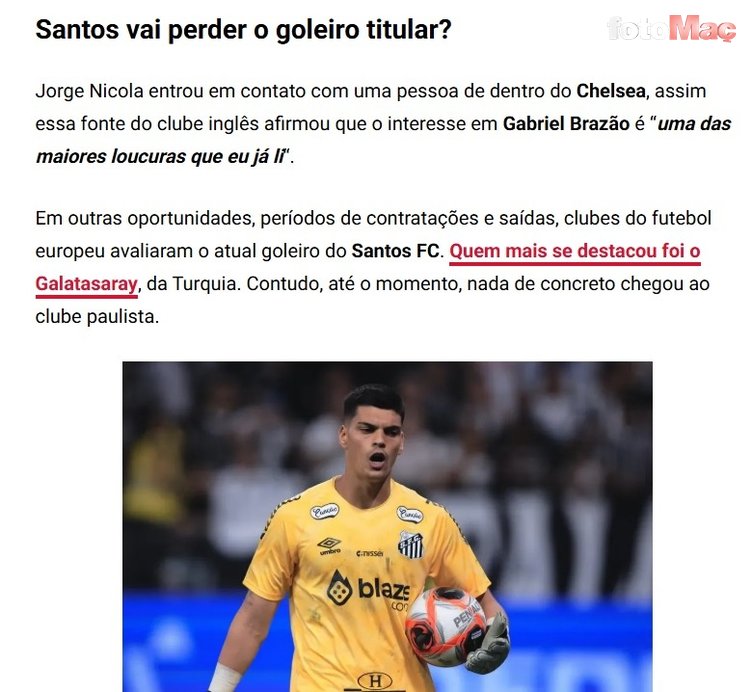 UOL Esporte kaynaklı haberde, 1.92 boyundaki file bekçisini sarı-kırmızılıların yanı sıra Chelsea ve Porto’nun da istediği belirtildi.