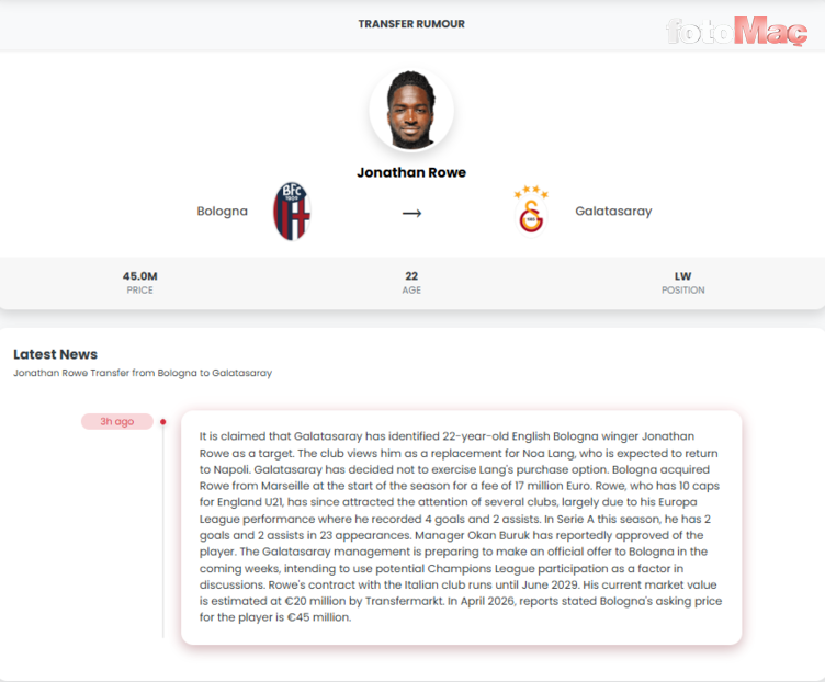 Haziran 2029’a kadar sözleşmesi bulunan Rowe’un güncel piyasa değeri yaklaşık 20 milyon euro olarak gösterilirken, Nisan 2026 itibarıyla Bologna’nın oyuncu için 45 milyon euro bonservis talep ettiği öne sürülüyor.