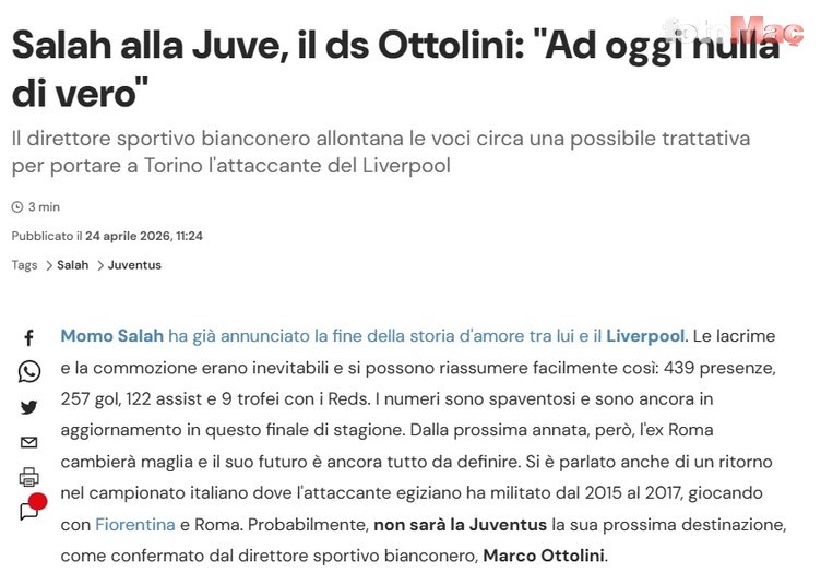 365Scores’a verdiği röportajda konuya açıklık getiren Ottolini, “Salah’ı transfer etmek için yürütülen görüşmeler olduğu yönündeki haberler doğru değil. Şu anda bu konuyla ilgili hiçbir şey yok.” ifadelerini kullandı.